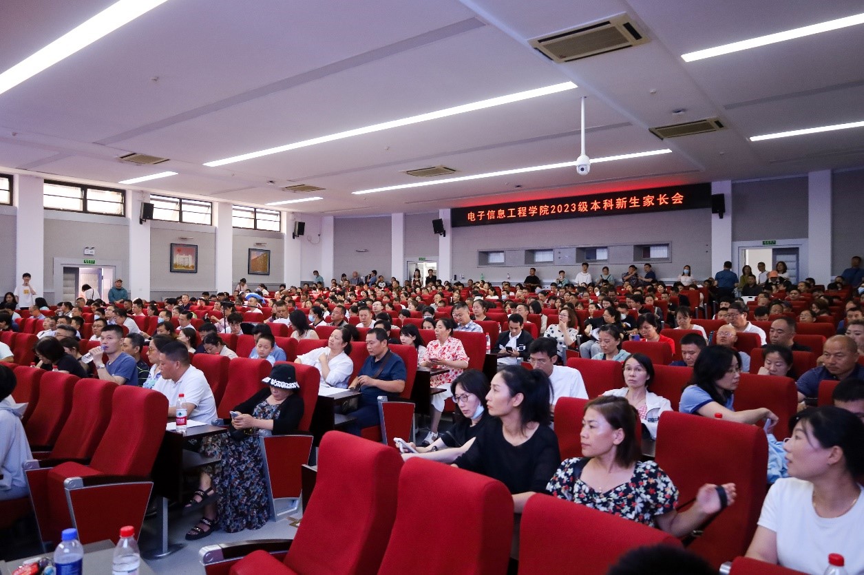 2023年8月29日下午,电信学院在中心报告厅召开2023级新生家长会。学院党委书记赵岚,院长艾渤,党委副书记韩柏涛,党委副书记、副院长王剑,副院长陶丹、刘留,教学科科长常卓,学工办主任冯麟淞,23级本科新生辅导员张欣煜、李晨宇出席会议。420余名新生家长现场参与,其他家长通过腾讯会议线上参与。会议由韩柏涛主持。