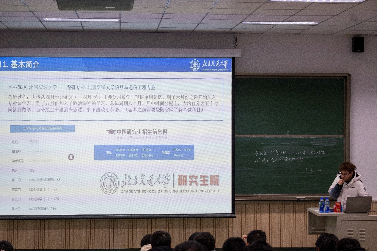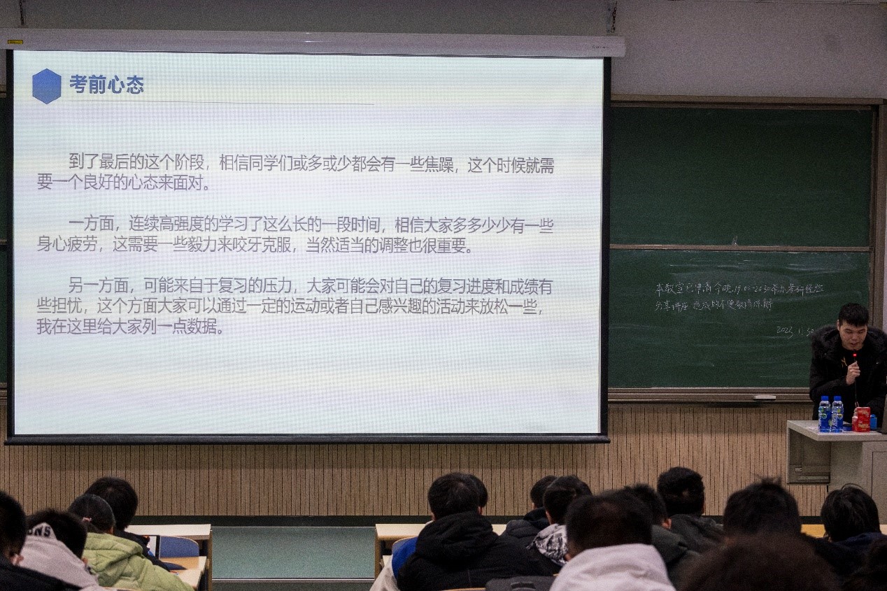 随后,杨梓涵分享了他考研的心路历程,着重介绍了最后一个月该如何科学安排做好复习规划,一是要写往年真题,二要多看教材,三在考试策略上,要先避重就轻,不要死磕一道题,提出在考研过程中,做到“不着急,不忙慌"。魏屿麒认为在最后的这个时间,考研的同学都会有些焦躁,但还是要有一个良好的心态去面对最后阶段的学习。在考前准备方面,杨梓涵和魏屿麒根据不同的科目介绍了不同的复习方法,保持一个良好的心态是成功的关键,要提前调整作息,保持良好的复习状态。最后两位学长耐心认真的解答了同学们提出的困惑,针对不同类型问题给出了有效可靠的建议。