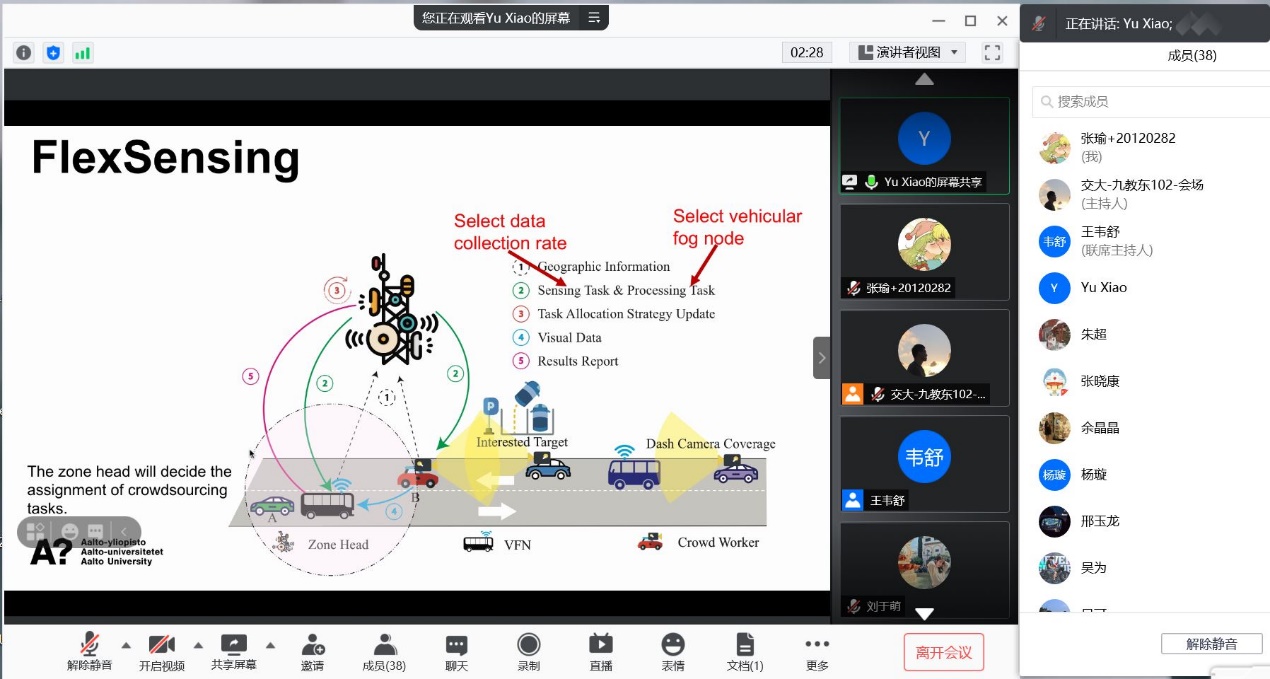 肖煜博士主要研究领域为边缘计算、群智感知及智能穿戴系统等,结合目前自动驾驶、边缘计算/雾计算的性能需求,介绍了边缘计算/雾计算的相关特征,并结合 5G NR 介绍了应用案例。随后展示了在研欧盟项目5G-MOBIX以及我校闻映红教授主持的中芬合作项目“通信资源受限场景下车辆自组网通信技术研究”的研究成果,主要包括实时任务边缘节点与中心的资源管理和分配方案、数据驱动的容量部署等。