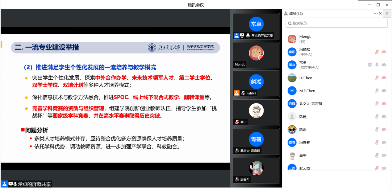 艾渤传达了张宏科院士和钟章队教授对电子信息类学科建设、本研人才培养的意见和建议,谈振辉、张思东、王均宏、王海波就工程教育、教学团队建设、办学定位、教学方针、评价指标与内涵建设关系、学生创新实践能力培养等问题进行了发言,陈后金线上介绍了参与学科、专业建设的经验和建议,邓涛介绍了本科生院在课程、教材、团队等内涵建设工作中的思路和关注重点。