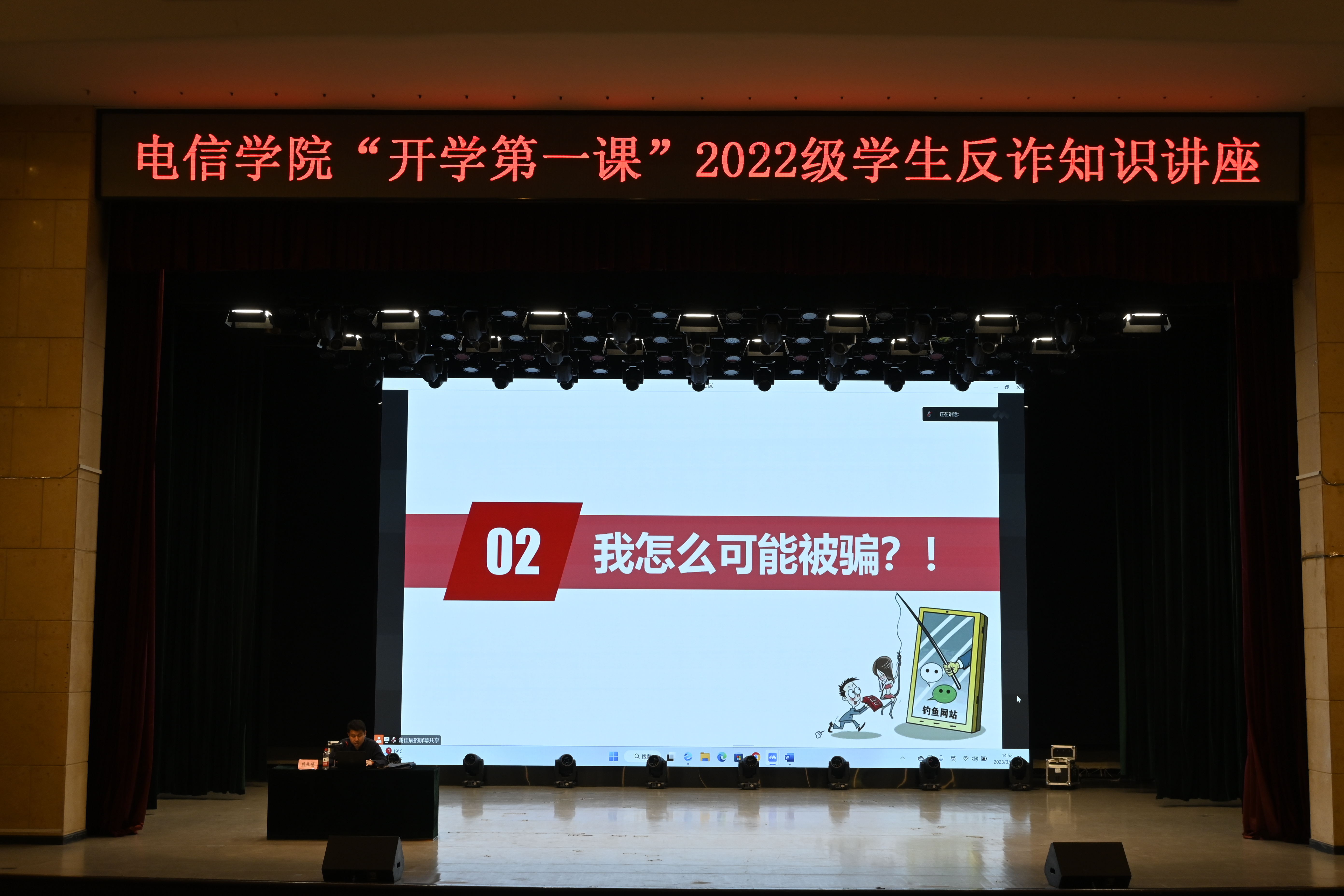 3月9日下午,电信学院联合学校保卫处在天佑礼堂举办“开学第一课”系列活动-2022级学生反诈知识讲座。本次讲座由保卫处殷兆堃老师主讲,电信学院2022级学生全体参与。