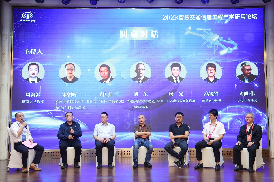 主题报告后,南京大学教授周海波主持了圆桌论坛,杭州电子科技大学空间信息研究院院长宋朝晖、西安电子科技大学领军教授毛国强、华鲲振宇智能科技有限责任公司高级副总裁刘东、阿里巴巴达摩院首席架构师杨光、南通大学教授高锐锋、深圳大学教授胡明伟等6位专家针对智慧交通信息工程行业关心的问题展开了深入的探讨,为产学研用合作提供了建设性的意见。
