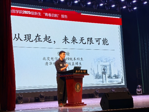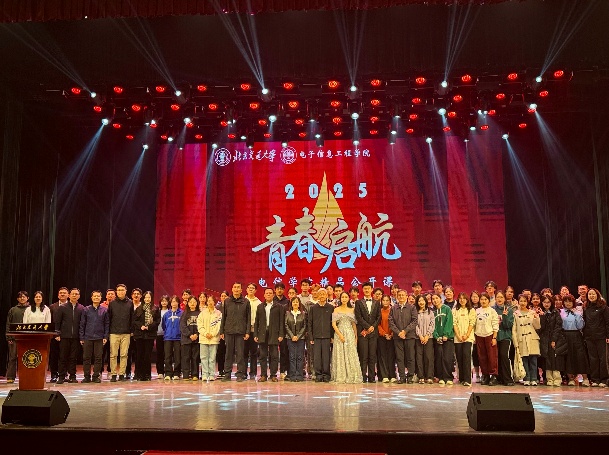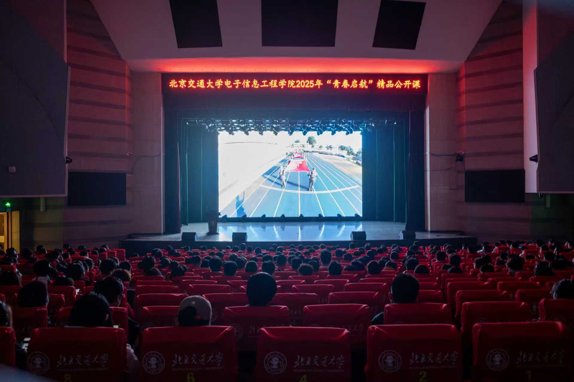 10月23日晚,电信学院在天佑会堂举办以“铭历史·珍爱和平;砺壮志·勇担使命;拓新程·绘就未来”为主题的“青春启航”精品公开课。公开课邀请到原校长谈振辉教授,校党委常委、副校长、电信学院院长艾渤教授,1998级校友、中信科智联车联网高级产研经理孙玉兰,学校团委书记魏炜,学生工作处副处长严伟恒,研究生工作部副部长王萌及学院全体领导班子,在唐山研究院及威海校区设置分会场同步直播,参会的还有电信学院2025级全体同学。